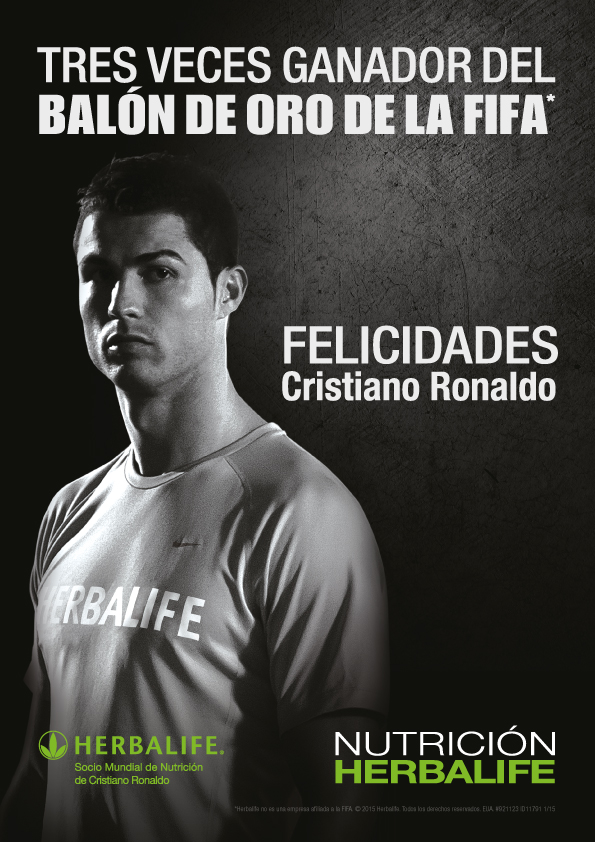 Herbalife, empresa global de nutrición, celebró la obtención del Balón de Oro por parte de Cristiano Ronaldo. El futbolista portugués, imagen de la compañía y fanático de sus productos, fue distinguido por tercera vez como el mejor jugador del mundo, recibiendo el 37,66% de los votos en la encuesta organizada por la FIFA.