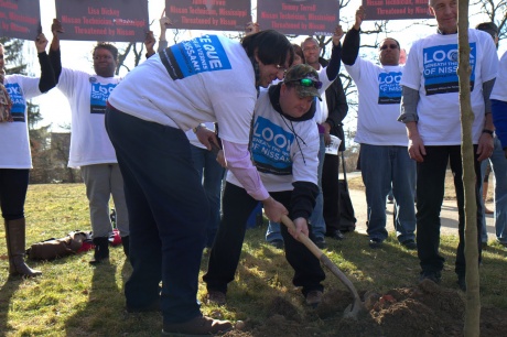 Trabajadores de una planta de Nissan en Mississippi (Estados Unidos) celebran una ceremonia de plantación de árboles frente al Salón del Automóvil de Ginebra el 7 de marzo, para pedir a los visitantes que “miren más allá del brillo de Nissan”.