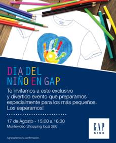 MONTEVIDEO, Agosto de 2013 – Se acerca el Día del Niño, y Gap planea una acción para incentivar la creatividad de los más pequeños, donde cada niño puede diseñar su propia remera Gap, y los más originales se llevarán su remera intervenida. Además, todos los diseños estarán en la tienda formando un mural, donde cada niño que haya participado podrá buscarse.