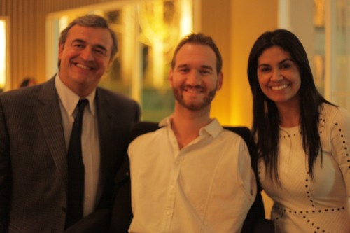 Su presencia ha sido posible por el esfuerzo de muchas organizaciones, fundamentalmente cristianas, y Vujicic desarrolla una amplia agenda en Uruguay: una reunión con el Presidente de la Cámara de Representantes, Germán Cardoso en la que además participaron integrantes de la Comisión Especial de Población y Desarrollo Social como la legisladora Verónica Alonso.