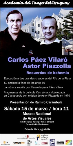 La División Promoción Cultural del Departamento de Cultura de la intendencia de Montevideo a través de su programa, Tango en obra», invita al espectáculo: «Carlos Páez Vilaró Astor Piazzolla. Recuerdos de Bohemia».