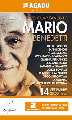 El Domingo 14 de setiembre, AGADU y la Fundación Benedetti organizarán un recital gratuito en la Sala Zitarrosa, donde reconocidos músicos y grupos uruguayos musicalizarán poemas del escritor. Las entradas ya se agotaron.