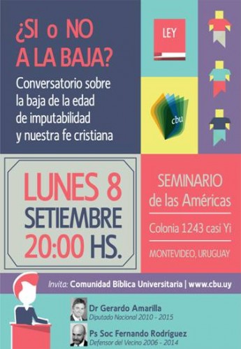 Queremos invitarte al conversatorio sobre la baja de la edad de imputabilidad y nuestra fe cristiana el Lunes 8 de setiembre a las 20 horas en la planta baja del Seminario Bíblico en Colonia 1243 (casi Yi).