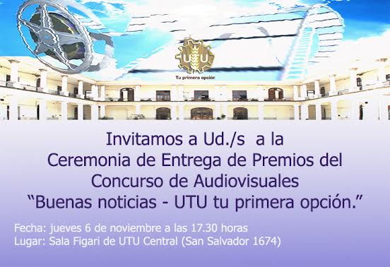 El Jueves 6 de noviembre, se realizará la ceremonia de entrega de premios a los grupos de estudiantes ganadores del concurso de audiovisuales 2014, organizado por la Dirección de Comunicaciones de UTU. Son dos premios y dos menciones especiales, elegidos por el Jurado y otro premio elegido por los seguidores de UTU en las redes sociales. Los ganadores son egresados o cursan diferentes niveles de educación y en distintas escuelas de Montevideo y de la ciudad de Mercedes.