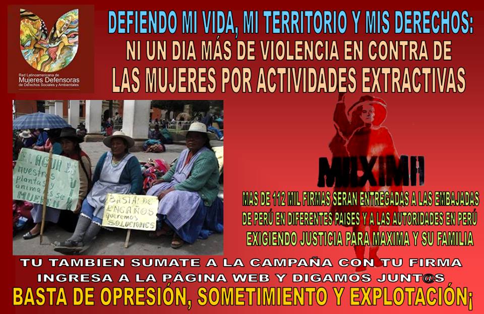 Frente a la violencia, persecución legal y tortura emocional que vive Máxima Acuña y su familia, por parte de la minera Yanacocha, los ojos del mundo, el cuerpo de las mujeres de América Latina están movilizad@s, prueba de ello es la carta con mas de 100 mil firmas en apoyo y respaldo a Máxima, exigiendo al Estado Peruano que haga justicia y que garantice la vida, la salud de máxima y su familia y que próximamente será entregada a las autoridades peruanas y a las embajadas de Perú en diferentes países.