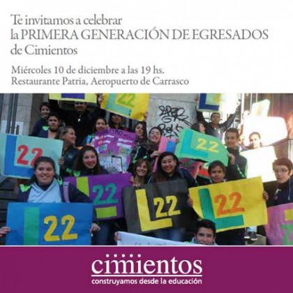 La Fundación Cimientos, que trabaja con jóvenes del Liceo Nº 22 de la teja desde hace ya tres años, tiene el orgullo de invitarlos a la entrega de diplomas de la primera generación de egresados del plan piloto que se llevó a cabo en Uruguay. También se expondrán los objetivos y planes de Cimientos para los próximos años en el país. Estarán presentes y harán entrega de los diplomas todas las empresas y personas que han apoyado a los jóvenes durante estos tres años.