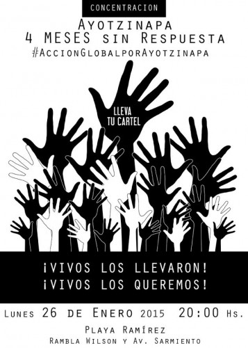 A cuatro meses de la masacre de Iguala, y en el marco de la octava Acción Global, el grupo Uruguay por Ayotzinapa convoca a la actividad “Una foto por Ayotzinapa” el Lunes 26 de enero, a las 20:00 horas en Playa Ramírez (Rambla Wilson y Av. Sarmiento).