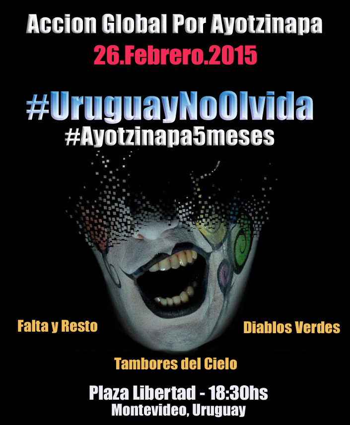 En el marco de la novena acción global el grupo Uruguay por Ayotzinapa convoca a concentrarse en la Plaza Libertad, el jueves 26 de Febrero a las 18:30 horas, en apoyo a las familias y contra el Terrorismo de Estado en México.