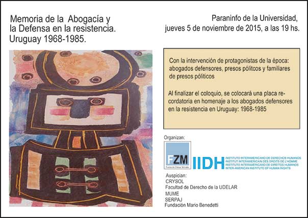 El día 5 de noviembre de 2015 a las 19 horas, en el Paraninfo de la Universidad de la República, la Fundación Zelmar Michelini en conjunto con el Instituto Interamericano de Derechos Humanos, realizarán en el Paraninfo de la Universidad la actividad «Memoria de la Abogacía y la Defensa, en la resistencia 1968-1985», la cual tiene como objetivo registrar y poner de manifiesto el importante papel que jugaron los abogados como usted durante aquellos años.