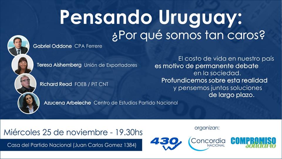 En el marco del ciclo Pensando Uruguay organizado por las agrupaciones Concordia Nacional, 430 Los Jóvenes Blancos y Compromiso Solidario, queremos invitarte a participar de un nuevo encuentro sobre un tema que importa: ¿Por qué somos tan caros?