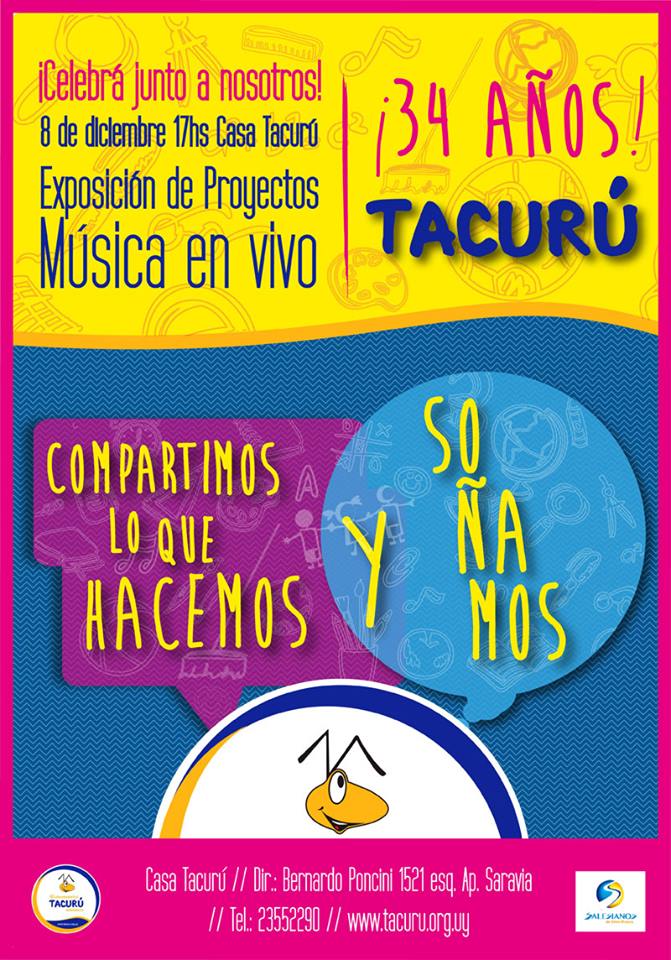 Movimiento Tacurú celebra sus 34 años Sociedad Uruguaya hace 10 años El martes 8 de diciembre el Movimiento Tacurú celebra sus 34 años. El festejo contará con exposición de proyectos y música en vivo. Será desde las 17 horas en Casa Tacurú (Bernardo Poncini 1521 esquina Aparicio Saravia).