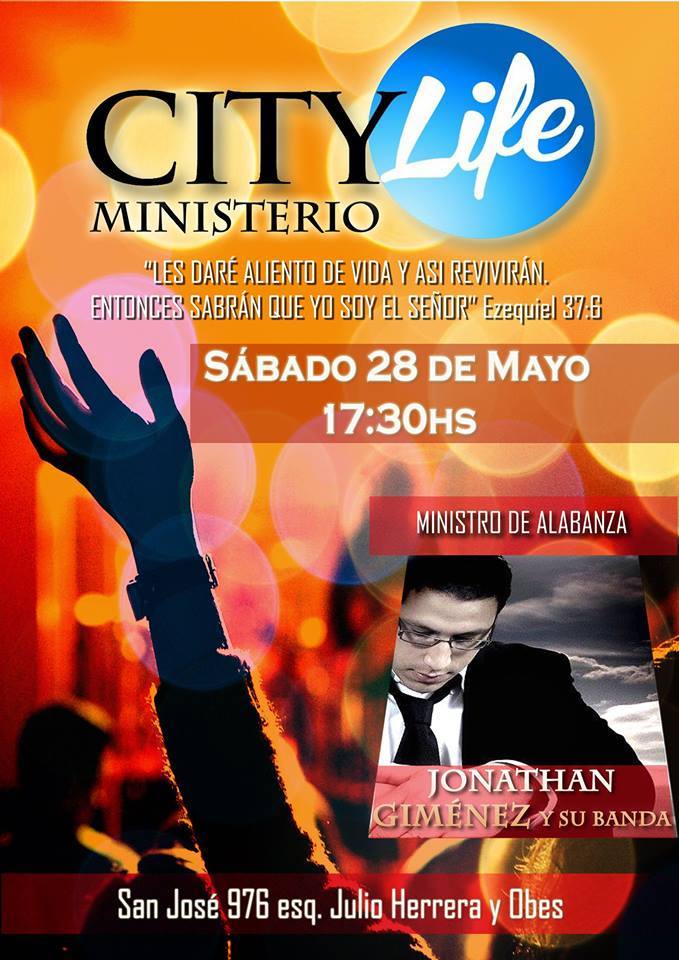 “Amigos están todos invitados, damos apertura de nuestro Ministerio como Iglesia CITY LIFE (Vida en la Ciudad). Sábado 28 de mayo, 17:30 Horas, San José 976 Esq. Julio Herrera y Obes. Contaremos con la presencia del ministro de alabanza Jonathan Giménez y su banda”, expresa Sebastián Vilar.