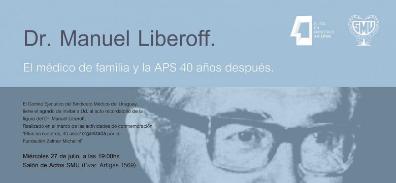 Invitación para el miércoles 27 de julio de 2016 a las 19 horas en el Salón de Actos del Sindicato Médico del Uruguay (Bvar. Artigas 1569, Montevideo-Uruguay), a «El médico de familia y la APS (Atención Primaria de Salud), 40 años después», que nos acerca al Dr. Manuel Liberoff como profesional y como ser humano.