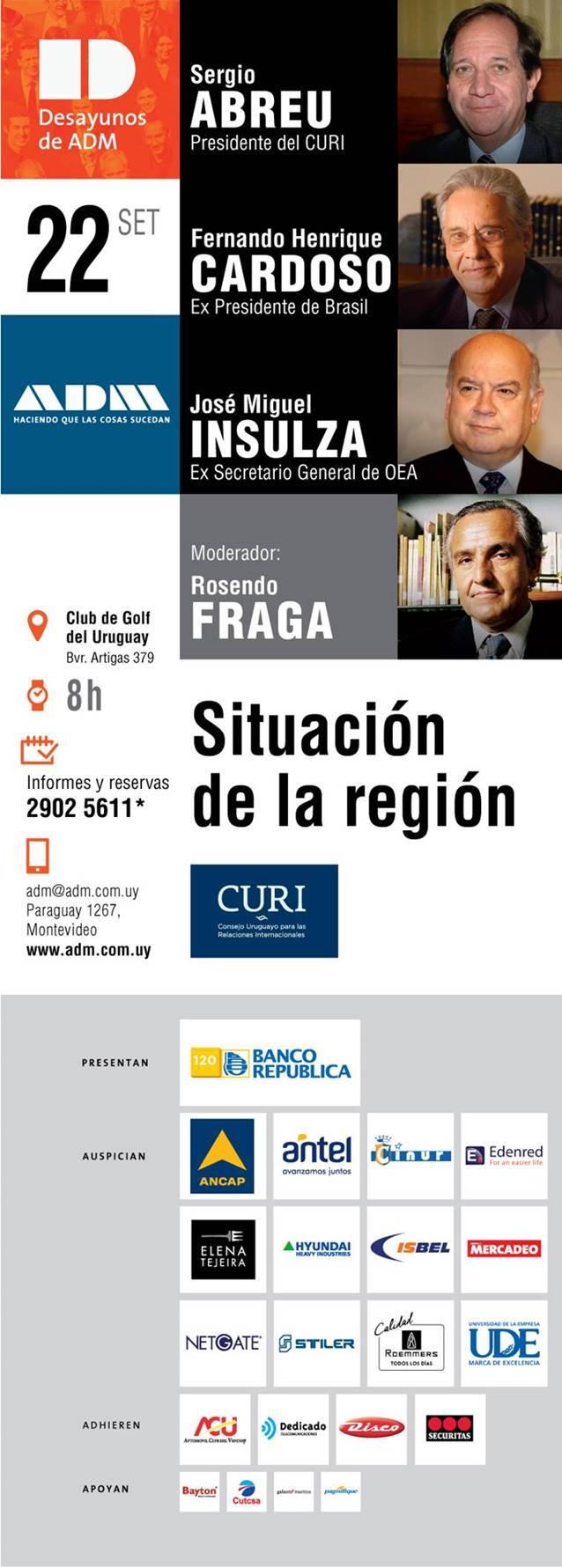 El evento estará a cargo del Lic. Fernando Cardoso (Ex Presidente de Brasil), Dr. José Miguel Insulza (Ex Secretario General de la OEA) y el Dr. Sergio Abreu (Presidente del CURI -Consejo Uruguayo para las Relaciones Internacionales), quienes realizarán un análisis profundo sobre la situación de la región. La actividad contará con el Dr. Rosendo Fraga (analista político, periodista e historiador argentino), como moderador.