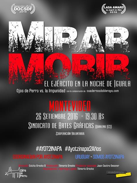 En Uruguay se participará de una nueva Acción Global por Ayotzinapa con la proyección del documental “Mirar Morir. El ejército en la noche de Iguala” el lunes 26 de Setiembre, formando parte de una proyección conjunta a nivel mundial en varias ciudades del planeta.