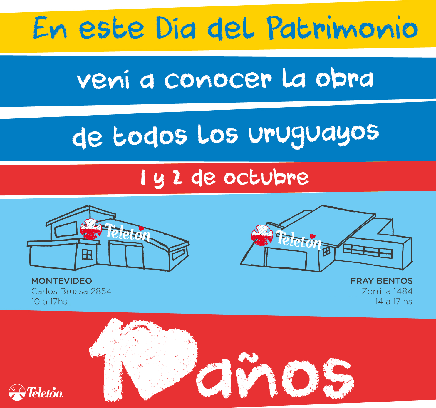 El próximo Día del Patrimonio se celebrará el fin de semana del sábado 1º y domingo 2 de octubre en todo el país. Como desde hace varios años, los Centros de Rehabilitación Teletón de Montevideo y Fray Bentos abrirán sus puertas. Este año, siguiendo la consigna propuesta por el Ministerio de Educación y Cultura: “Educación Pública, Patrimonio Nacional. Integral, integradora, integrada”, haremos foco en la educación inclusiva y el trabajo que hace la Fundación para propiciarla. Todo el equipo médico-técnico trabaja para que la inclusión en las escuelas y liceos de los niños y adolescentes que se atienden en los Centros Teletón sea posible. Es por esto que se realizan esfuerzos específicos, como la innovación en tecnología aplicada a la rehabilitación (adaptación de las Ceibalitas, por ejemplo) y las visitas de los profesionales a los diferentes centros educativos a los que asisten los niños y adolescentes que se atienden en Teletón. En Montevideo, el Centro estará abierto sábado y domingo de 10 a 17 horas. La propuesta incluye visitas guiadas cada media hora, una exposición de arte y una propuesta de artes plásticas vinculada a la inclusión. En Fray Bentos, el Centro abre sábado y domingo de 14 a 17 horas. Los visitantes podrán conocer de primera mano el trabajo que allí se realiza y conocer más sobre la historia y el trabajo que Fundación Teletón ha realizado en estos años gracias al apoyo de todos los uruguayos.