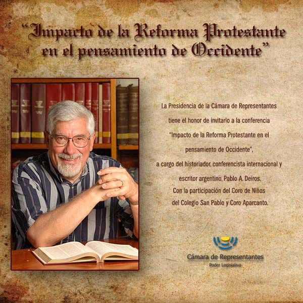 La Presidencia de la Cámara de Representante invita a la conferencia que tendrá lugar el Lunes 31 de Octubre sobre el tema “Impacto de la Reforma Protestante en el pensamiento de Occidente”, a cargo del historiador, conferencista internacional y escritor argentino, Pabla A. Deiros.