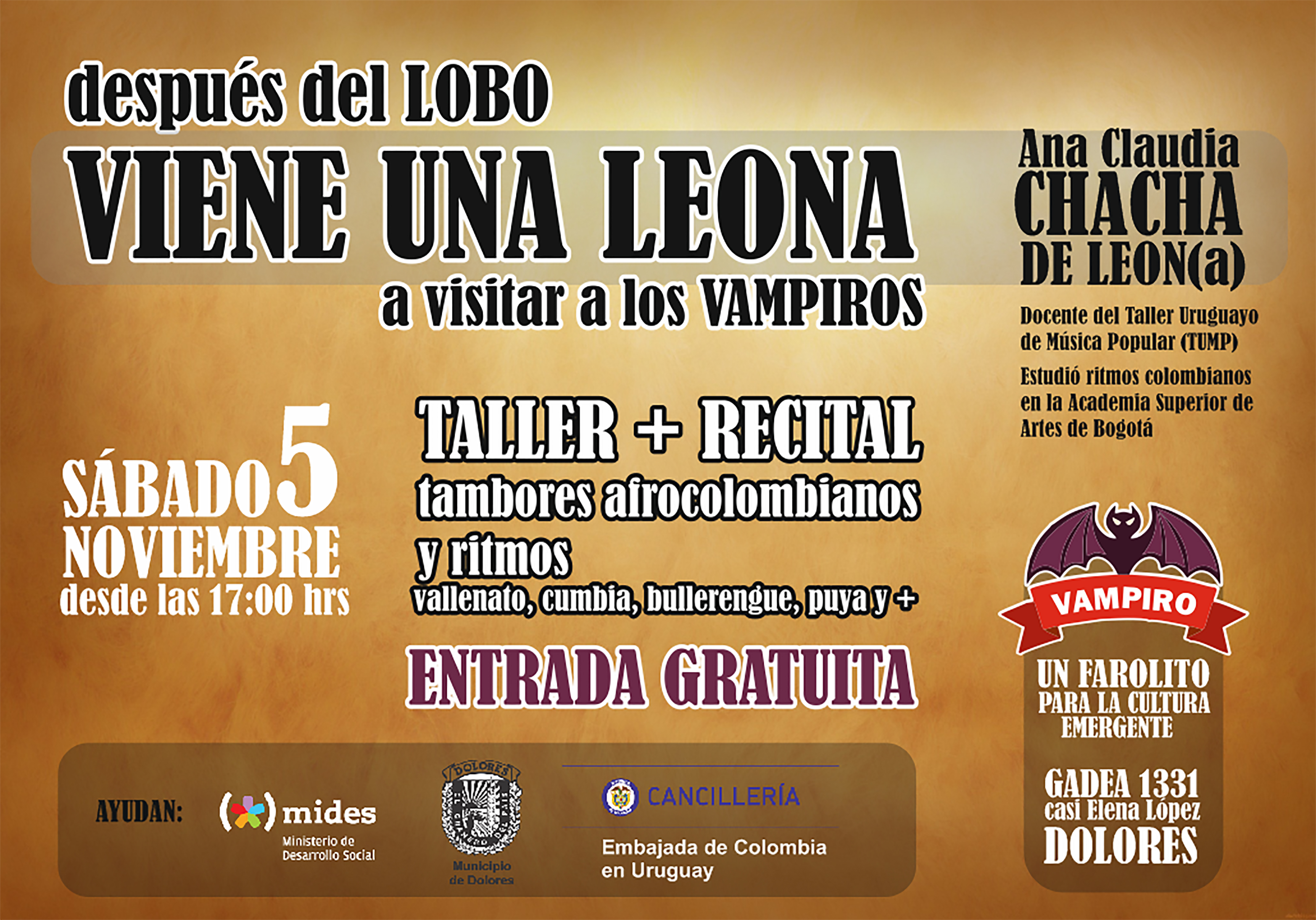 En el Centro Cultural Vampiro se estará presentando Ana Claudia De León, para realizar una actividad que comprende taller y recital sobre tambores colombianos, y a la que acompañarán una buena cantidad de músicos locales.