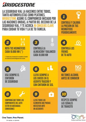 Bridgestone, la compañía de neumáticos más grande del mundo, te acompaña en estas fiestas y en las vacaciones de verano con estos pequeños consejos sobre seguridad vial. Son parte del compromiso con el Decenio de Acción para la Seguridad Vial establecido por la Organización de las Naciones Unidas (ONU), con el objetivo general de estabilizar y reducir las cifras de víctimas mortales en accidentes de tránsito en todo el mundo.