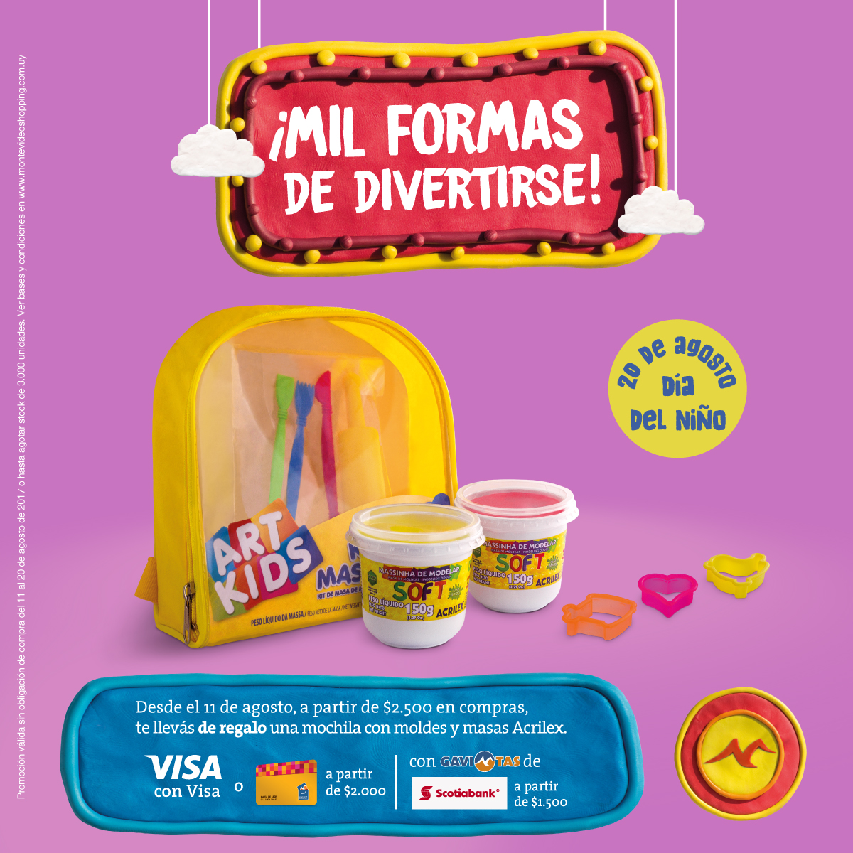 Para el Día del Niño, Montevideo Shopping apuesta a la creatividad y la diversión, con una promoción que regala una mochila repleta de moldes y masas Acrilex.