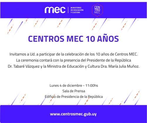 Con la presencia del Presidente Tabaré Vázquez y de la ministra de Educación y Cultura, María Julia Muñoz se celebrará este lunes 4 de diciembre los 10 años de los Centros MEC.