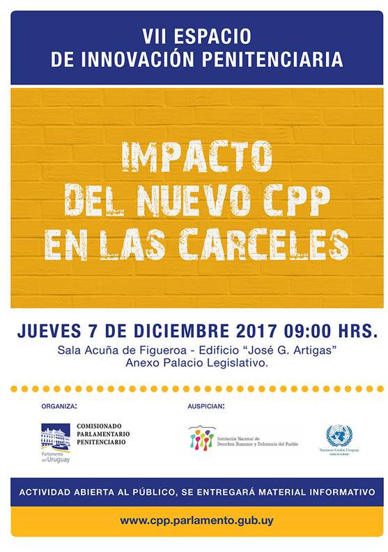 El Jueves 7 de diciembre, a partir de la hora 9:00 en el Pasaje Acuña de Figueroa del Edificio Anexo del Palacio Legislativo, se realizará el VII Espacio de Innovación Penitenciaria, que se centrará en el tema “Impacto del nuevo Código del Proceso Penal en las cárceles”. La actividad es organizada por el Comisionado Parlamentario Penitenciario y auspiciada por la Institución Nacional de Derechos Humanos y Defensoría del Pueblo.