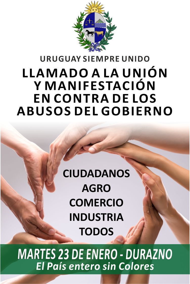 La Asociación de Cultivadores de Arroz, la Asociación Nacional de Productores de Leche, la Asociación Rural del Uruguay, las Cooperativas Agrarias Federadas, la Comisión Nacional de Fomento Rural y la Federación Rural exhortan a los productores rurales de todo el país a acompañar la Asamblea convocada para el próximo martes 23 de enero, hora 16, en la ciudad de Durazno, en el local Santa Bernardina.