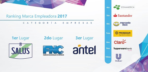 En la categoría empresas Compañía Salus lidera el ranking desde el año 2016, seguido de cerca desde la pasada edición por Fábricas Nacionales de Cerveza; ANTEL, Zonamérica, Banco Santander, Prosegur, Claro y Unilever son algunas de las marcas que integran la lista de las diez empleadoras de preferencia en nuestro país.