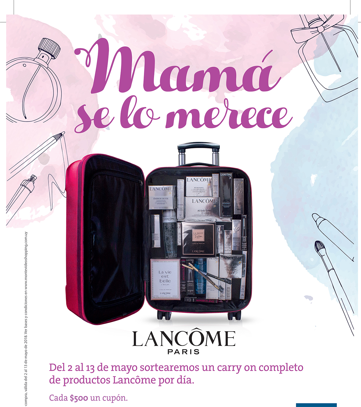 Montevideo Shopping lanzó dos promociones para el Día de la Madre, una de ellas sortea una valija “carry on” de productos Lancôme por día, al tiempo que también canjeando boletas de compra se accede a un deslumbrante ser de pinceles profesionales para maquillaje.
