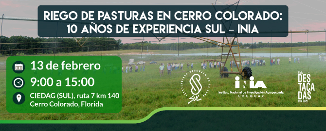 En el marco del Ciclo «Destacadas INIA 2020», el Secretariado Uruguayo de la Lana (SUL) y el Instituto Nacional de Investigación Agropecuaria (INIA) organizan la Jornada de Divulgación “Riego de pasturas en Cerro Colorado: 10 años de experiencia SUL – INIA”.