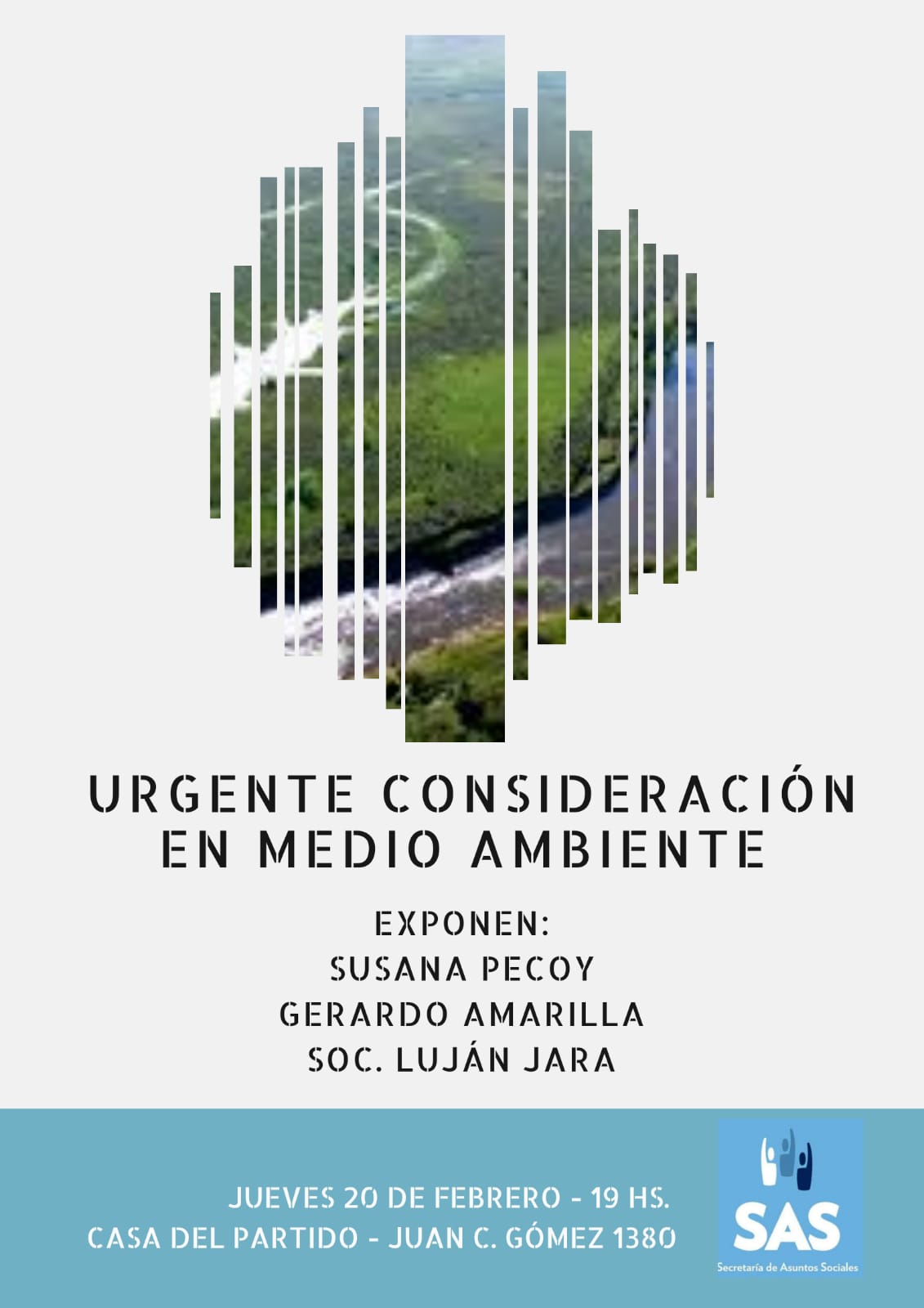 Bajo la convocatoria “Urgente Consideración en Medio Ambiente”, la Secretaría de Asuntos Sociales (SAS) del Partido Nacional convoca a una instancia con tres ponencias sobre el tema a cargo de: la ingeniera química Susana Pecoy, el diputado Gerardo Amarilla, Master en Derecho Ambiental, y la socióloga Luján Jara.