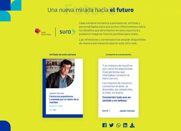 La iniciativa, realizada en conjunto con Hay Festival, está dirigida a colaboradores de SURA, actores clave y la ciudadanía en general, e invita a pensar sobre lo acontecido a raíz de la expansión de este virus, que ha hecho temblar al planeta y ha llevado a la humanidad al confinamiento, transformando para siempre la forma en que viviremos.
