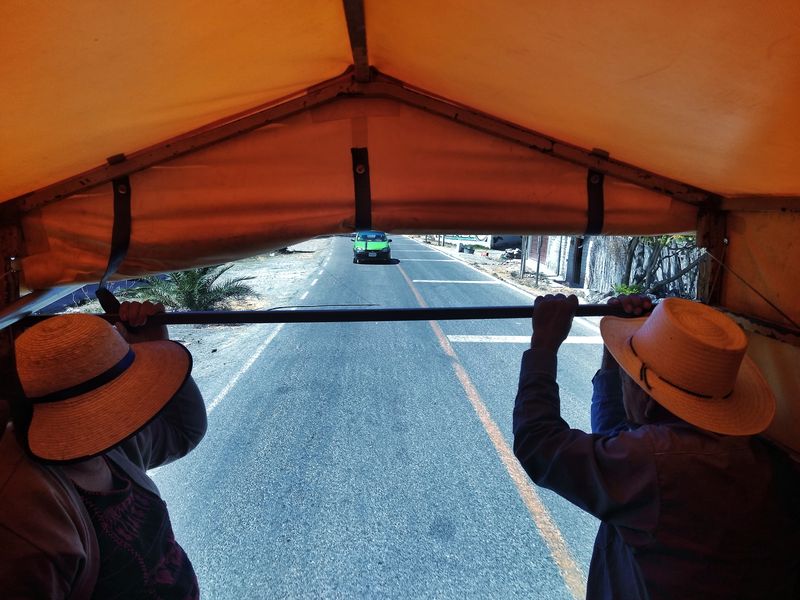 La camioneta, medio de transporte bastante utilizado en pueblos pequeños de Latinoamérica, usaba la caja para transportar personas, y tenía una lona a modo de techo, y un par de asientos largos a los costados para que la gente pudiera sentarse; íbamos en compañía de 3 señores de bigote, y una señora cargada con bolsas. Todos vestían de forma muy campechana y humilde con la prolijidad que los años les inculcaron; los hombres tenían bigote blanco, y al menos 80 años en su haber. La señora, que rondaba los 60, se bajó a medio camino, pegando un salto con una agilidad que ni Bambi, mirá.