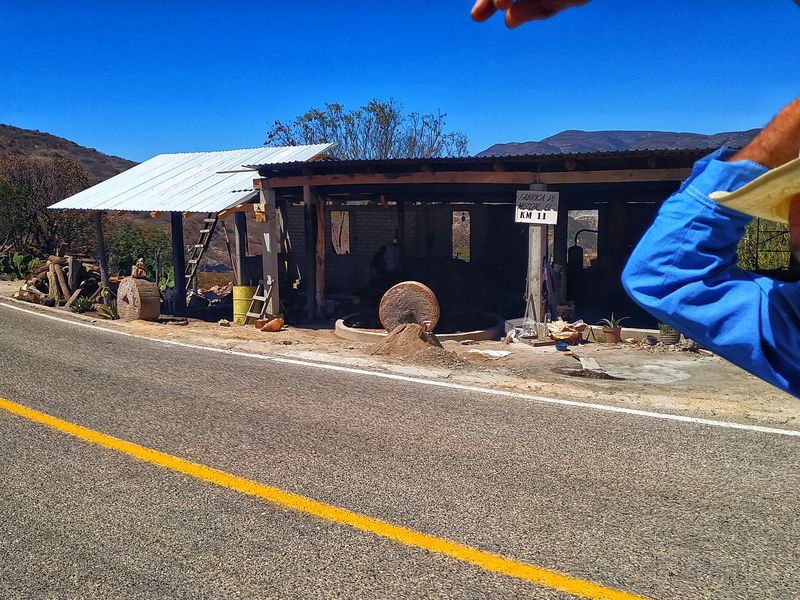 En el camino hacia Hierve el Agua no vimos una, ni dos, ni tres fábricas de Mezcal, sino al menos 10, y todas con ese estilo tan rudimentario y clásico que habíamos presenciado en nuestro camino hacia Oaxaca; la rueda de piedra, con un cilindro que encajaba en ella, y el cual era movido en círculos por un burrito que caminaba sin pausa pero sin prisa a su alrededor.