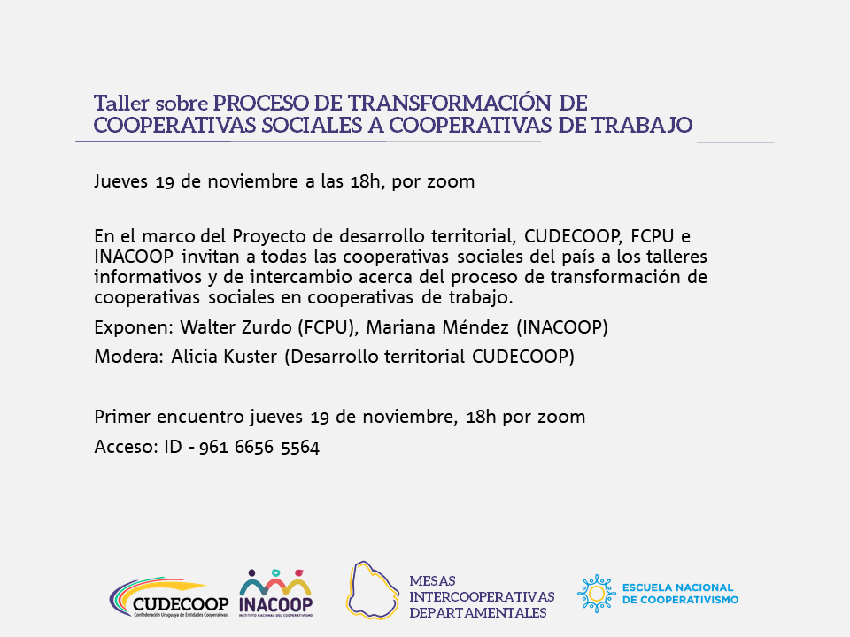 En el marco del Proyecto de desarrollo territorial, CUDECOOP, FCPU e INACOOP invitan a todas las cooperativas sociales del país a los talleres informativos y de intercambio acerca del proceso de transformación de cooperativas sociales en cooperativas de trabajo.