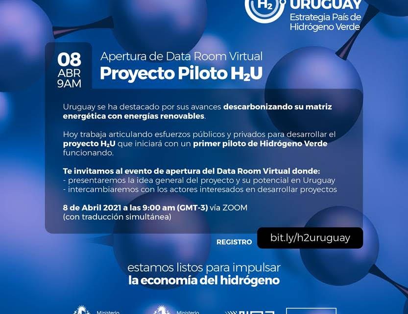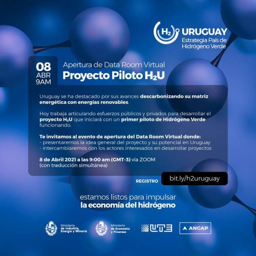 El Ministerio de Industria, Energía y Minería (MIEM), ANCAP y UTE vienen trabajando en conjunto para promover el proyecto H2U, con el objetivo de desarrollar un primer piloto de hidrógeno verde en el país a partir de la articulación de esfuerzos públicos y privados. En este marco, se realizará un data room virtual el jueves 8 de abril a la hora 9.00 con la finalidad de presentar la idea general del proyecto y promover el intercambio con los diferentes actores interesados en desarrollar este tipo de iniciativas.