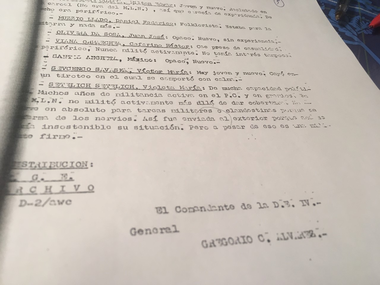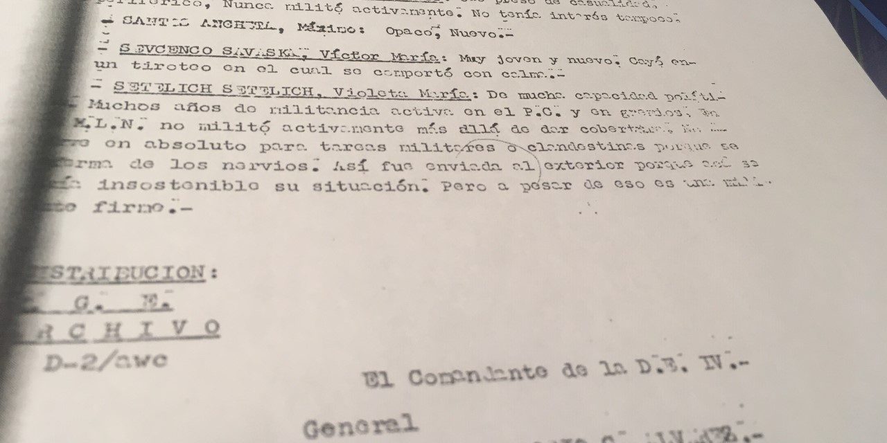 SETELICH SETELICH, Violeta María: De mucha capacidad política. Muchos años de militancia activa en el P.C. y en gremios. En el M.L.N. no militó activamente más allá de dar cobertura. No sirve en absoluto para tareas militares o clandestinas porque se enferma de los nervios. Así fue enviada al exterior porque se hacía insostenible su situación. Pero a pesar de eso es una militante firme.
