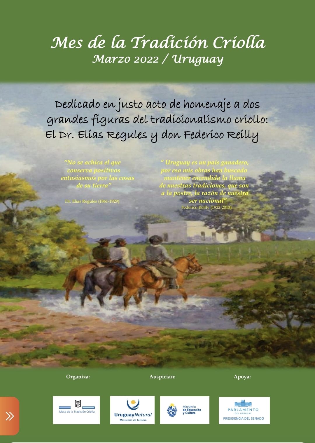 Con la presencia de la Presidenta de la Asamblea General, escribana Beatriz Argimón el jueves 3 de marzo, a las 11:30 horas, se realizará el Lanzamiento del Mes de la Tradición Criolla, homenaje al doctor Elías Regules Federico Reilly,  en el Salón de los Pasos Perdidos del Palacio Legislativo. Participarán del encuentro el ministro Pablo Da Silveira (en caso que así sea será a través de un mensaje ya que se encuentra con COVID), o en su lugar un representante del MEC, el Ministro de Turismo, Tabaré Viera, el periodista Juan Carlos López y el organizador Mario Correa.