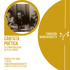 La Fundación Mario Benedetti, conjuntamente con la Embajada de Cuba en el Uruguay, tiene el agrado de invitarles a la Cantata Poética que tendrá lugar el próximo sábado 23 de abril a las 17 horas.