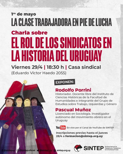 La charla será sobre “El rol de los sindicatos en la historia del Uruguay”, y se desarrollará el viernes 29 de abril a la hora 18.30 en la sede sindical de Eduardo Víctor Haedo 2055.