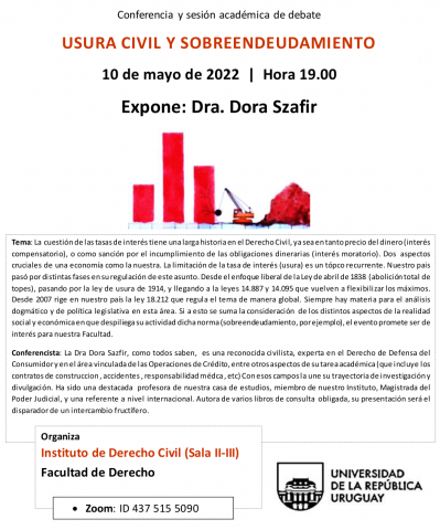 Conferencista: La Dra Dora Sazfir, como todos saben, es una reconocida civilista, experta en el Derecho de Defensa del Consumidor y en el área vinculada de las Operaciones de Crédito, entre otros aspectos de su tarea académica (que incluye los contratos de construcción , accidentes , responsabilidad médica , etc) Con esos campos la une su trayectoria de investigación y divulgación. Ha sido una destacada profesora de nuestra casa de estudios, miembro de nuestro Instituto, Magistrada del Poder Judicial, y una referente a nivel internacional. Autora de varios libros de consulta obligada, su presentación será el disparador de un intercambio fructífero.