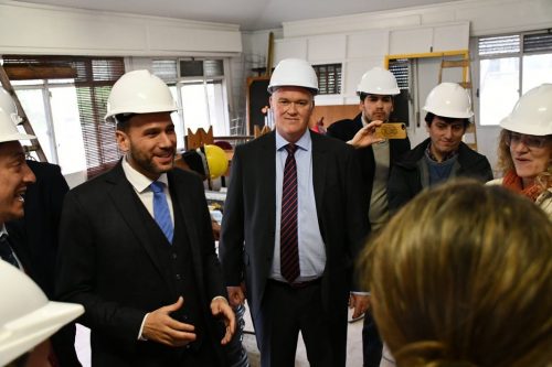 En la foto se observa al titular del Ministerio de Desarrollo Social, Martin Lema, la subsecretaria del Mides, Andrea Brugman, el subsecretario del Ministerio de Transporte y Obras Públicas, Juan José Olaizola y el Director Santiago Borsari recorriendo las obras en el Centro de Rehabilitación Visual Tiburcio Cachón.