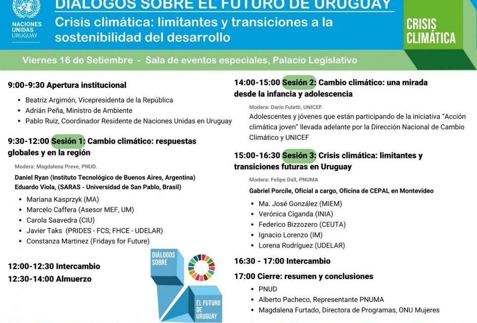 En el marco de los denominados Diálogos sobre el futuro de Uruguay organizados por Naciones Unidas, se llevará a cabo el Conversatorio: Crisis climática limitantes y transiciones a la sostenibilidad del desarrollo.