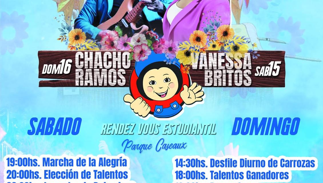 Esta popular fiesta se llevará a cabo el sábado 15 y domingo 16 de octubre, en Parque Caseaux, arrancando con la popular marcha de la alegría que se irá amenizando con la presentación de diversos artistas para continuar el día domingo con el desfile de carrozas a las 14.30. La concentración de carrozas se realizará en Bulevar de Florencio Sánchez, desde calle Libertad, iniciándose el desfile por Bulevar Cardona a contramano, sobre la senda sur hasta llegar a la calle Elías Regules, ingresando por la misma hasta calle Artigas, finalizando en el Parque Caseaux donde se desarrollarán los espectáculos.