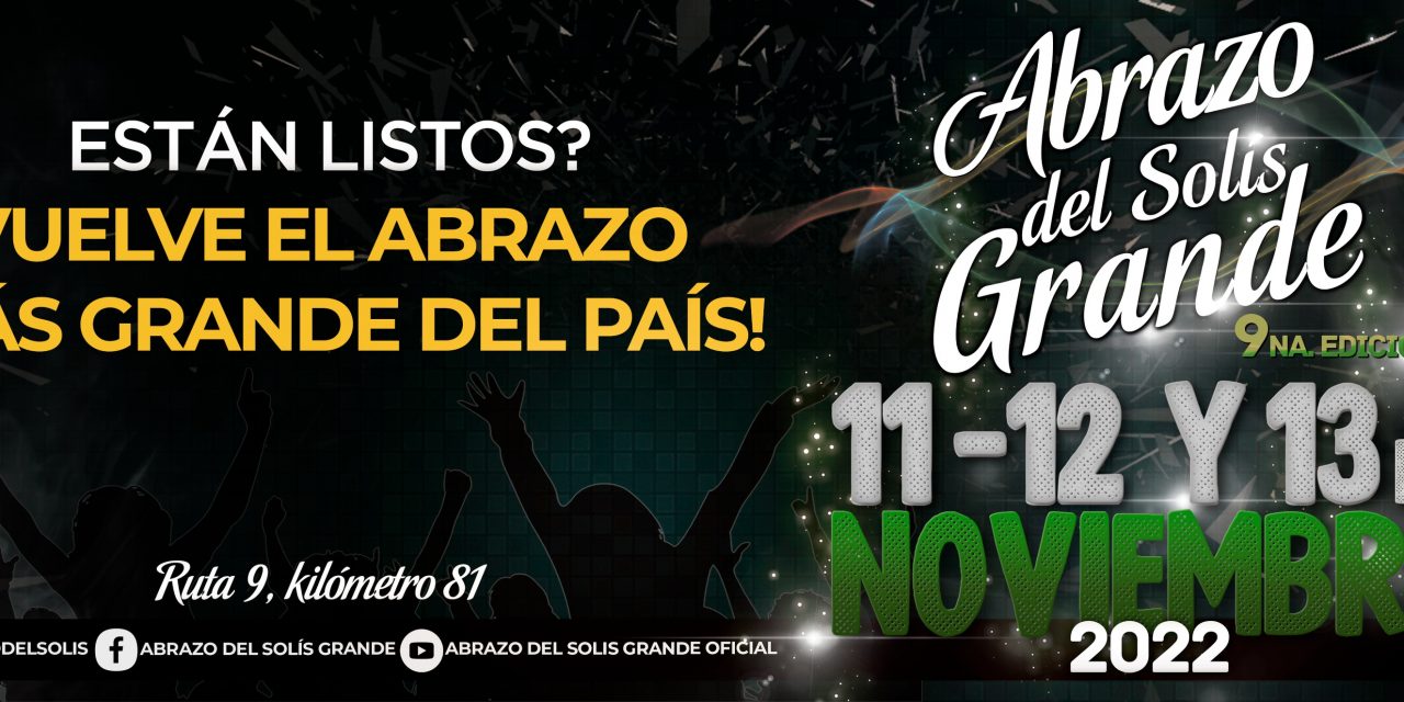 Abrazo del Solís Grande: ¿qué días será? Oct 9, 2022 | Asociaciones y Otros, Destacados, Entretenimiento | 0 | Se viene el Abrazo del Solís Grande: ¿qué días será?. Se llevará a cabo los días 11, 12 y 13 de noviembre de 2022 en Ruta 9 kilómetro 81.