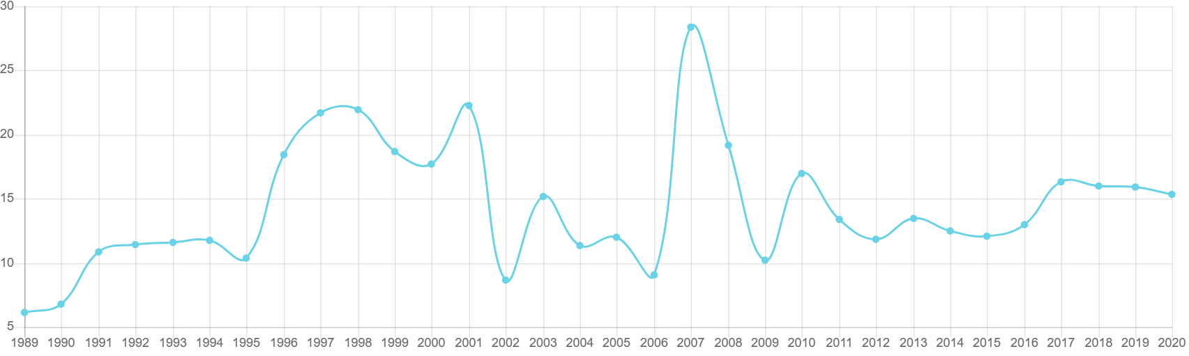 El de menor ingresos, fue en 1989 con 6,16 millones y luego, 1990 con 6,79 millones.