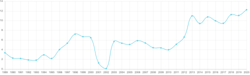 El de menor ingresos fue, coincidente con la mayor crisis del país en el siglo XXI, en el 2002 percibieron por dicho tributo 0,08  millones, y luego  el año 201 con 1,29 millones.
