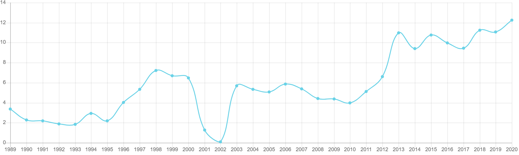 El de menor ingresos fue, coincidente con la mayor crisis del país en el siglo XXI, en el 2002 percibieron por dicho tributo 0,08 millones, y luego el año 201 con 1,29 millones.