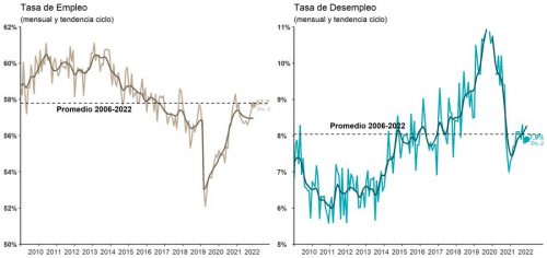 En términos desestacionalizados, el #empleo no logra alcanzar el dinamismo de los primeros meses del año, mientras que el #desempleo se mantiene en 7,9-8,2% desde jun22.