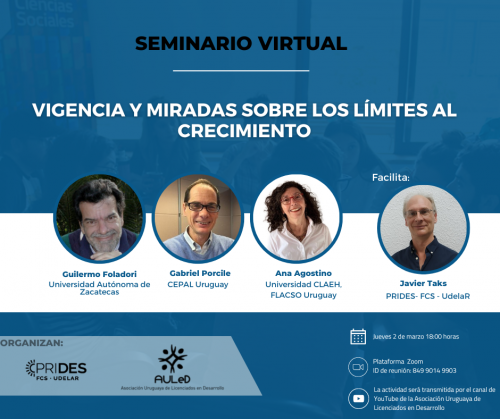 El Programa de Investigación en Desarrollo Sostenible (Prides) de la Facultad de Ciencias Sociales (FCS) y la Asociación Uruguaya de Licenciados en Desarrollo (Auled) invitan a participar del seminario virtual «Vigencia y miradas sobre los límites al crecimiento», que se realizará el 2 de marzo a las 18 horas, a través de la plataforma Zoom y del canal de Youtube de la Auled.